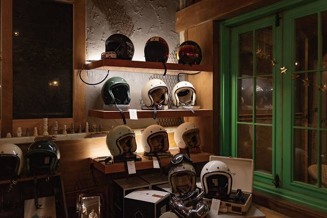 벽면 한편에는 클래식 헬멧이 진열되어 있다. 쿤타치는 클래식 헬멧 및 어패럴 브랜드다. 모터사이클용 헬멧으로 KC 인증을 받은 클래식 스타일 오픈페이스 헬멧이다. 클래식한 디자인에 파스텔톤 컬러가 더해져 스타일을 완성했다. 헬멧 진열장 옆에는 쿤타치의 의류가 걸려있다. 홀슈베이 카페의 클래식한 분위기와 잘 어울리는 브랜드다.