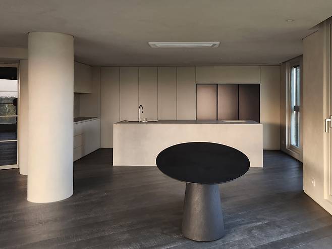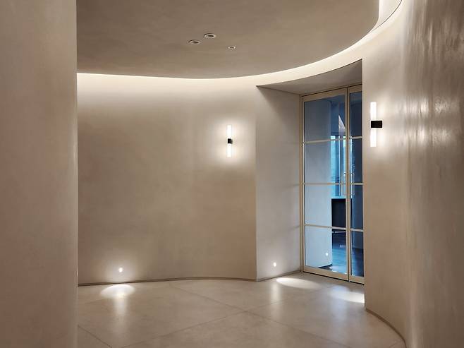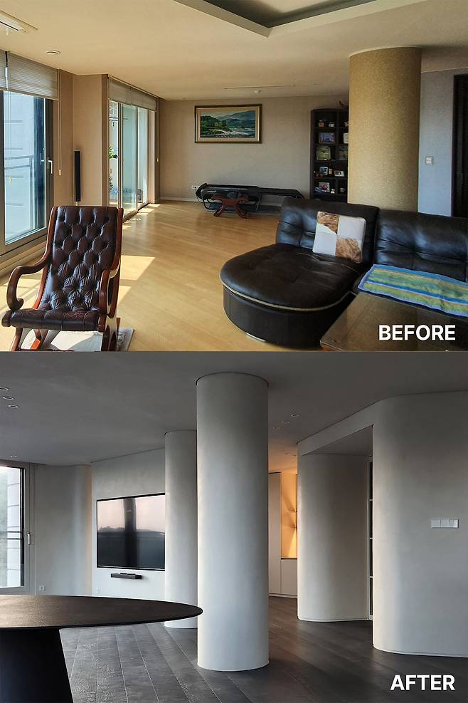 거실의 중간에 있는 원형 기둥을 모티브로 삼아 공간 전반에 라운드 디자인을 적용했다. 전체 공간의 벽과 천정은 같은 스페셜 페인팅 도장으로 마감하여 공간의 은은하고 고급스러운 분위기를 연출했다. 바닥은 채도가 낮고 어두운 톤의 마루로 마감하여 공간을 잡아주는 역할을 한다.