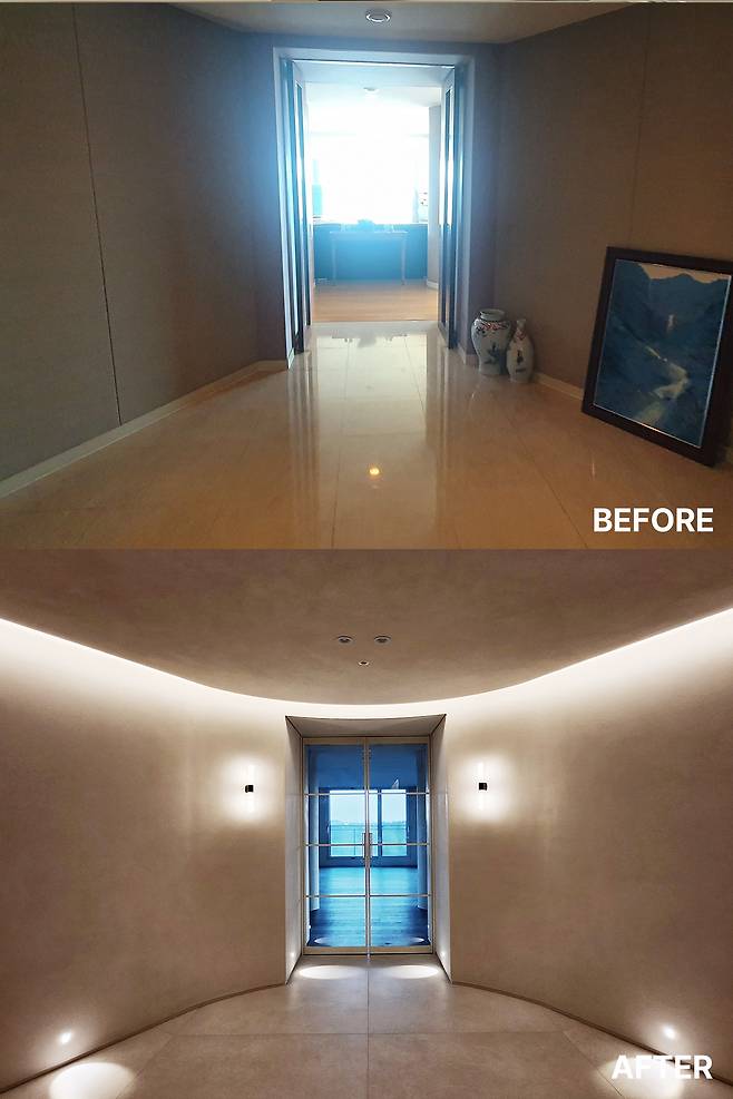 본래 공간이 가진 구조적 한계를 디자인으로 풀어내는 것이 가장 중요한 프로젝트였다. 현관부터 거실까지 가는 동선은 점점 공간이 넓어지며 시퀀스가 확장된다.