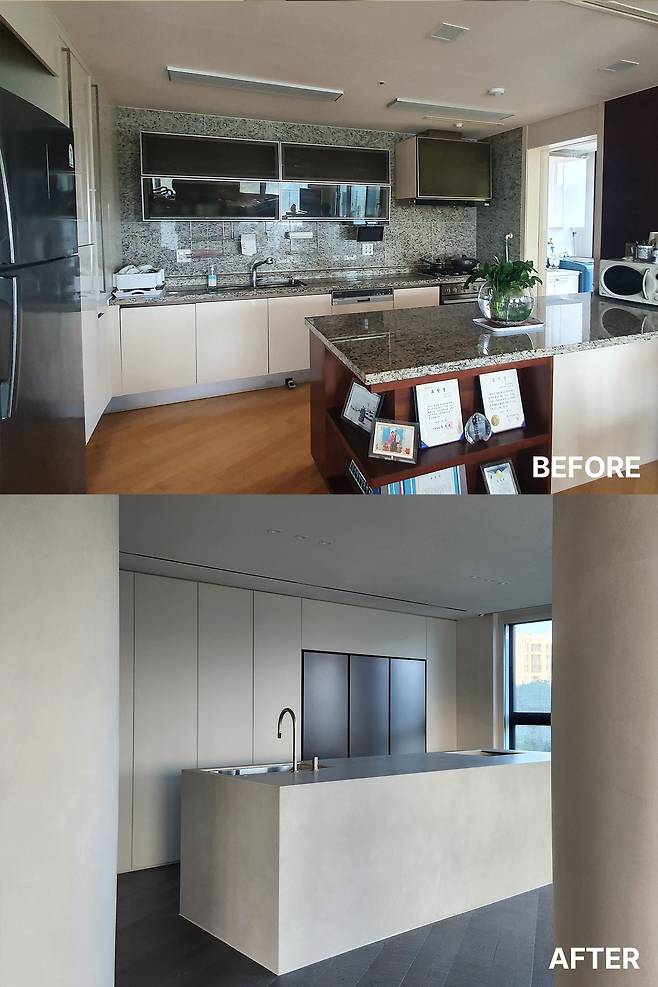 미우가 디자인 스튜디오는 오랜 시간이 지나도 변하지 않는 가치를 지향한다. 무채색의 점과 선 그리고 면으로 구성한 래미안이스트팰리스는 미우가 디자인 스튜디오의 감각에 부합하는 리모델링 사례다. 정제된 미니멀 무드로 새롭게 태어난 래미안이스트팰리스의 비포 그리고 애프터.