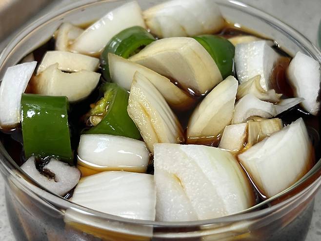 간장, 식초, 물, 설탕은 모두 1:1:1:1 비율로 넣습니다. 양파 1개 기준 종이컵 약 반 컵씩 넣으면 됩니다.