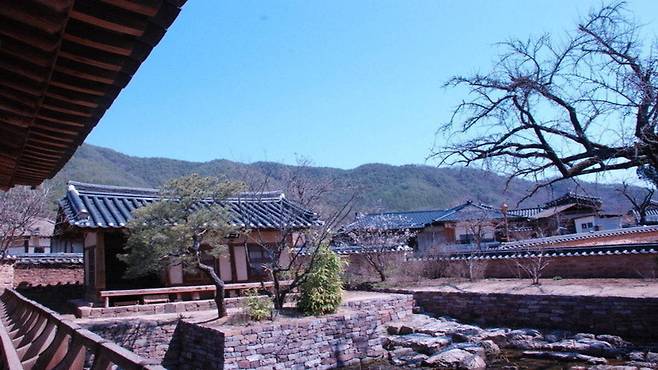 경정(敬亭)이라 불리는 대청마루에 서면 직사각형 모양의 연못과 주변 경관이 한눈에 들어옵니다.