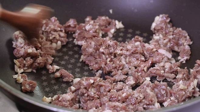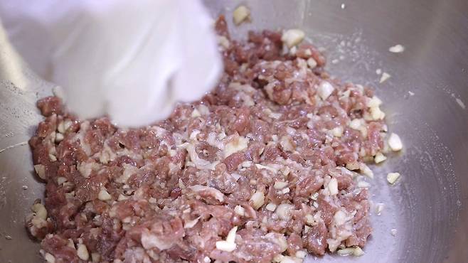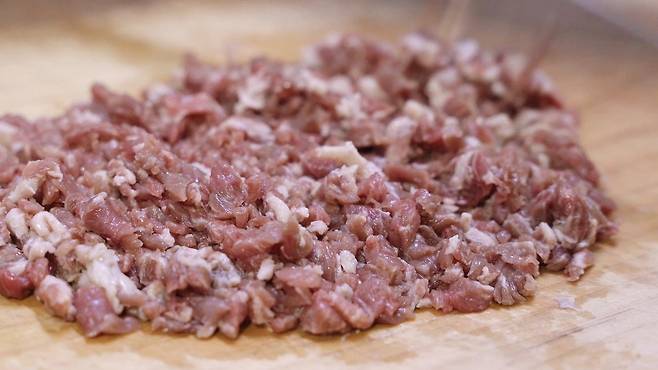 그리고 고기도 함께 다져 놓으세요. 미리 다져 놓은 고기를 사면 편하지만, 직접 다져서 사용하면 먹을 때 식감이 더욱 좋답니다. 그래서 저는 직접 다져서 사용했어요.