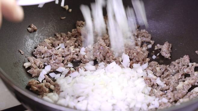 고기가 중간쯤 익어다 싶으면, 양파를 넣으세요. 그리고 완전히 고기가 익도록 함께 볶으세요.