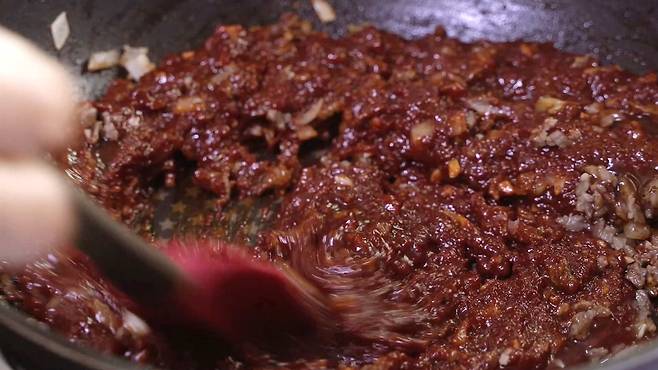 어느 정도 고추장이 볶아졌을 때 불을 끄면 됩니다.
