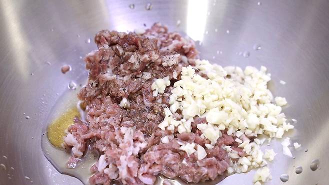 그리고 고기도 함께 다져 놓으세요. 미리 다져 놓은 고기를 사면 편하지만, 직접 다져서 사용하면 먹을 때 식감이 더욱 좋답니다. 그래서 저는 직접 다져서 사용했어요.