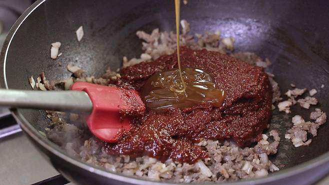 고기가 익었다 싶을 때, 고추장과 물엿을 넣으세요. 그리고 중불로 바꾼 후, 3~4분 정도 볶으면 된답니다.