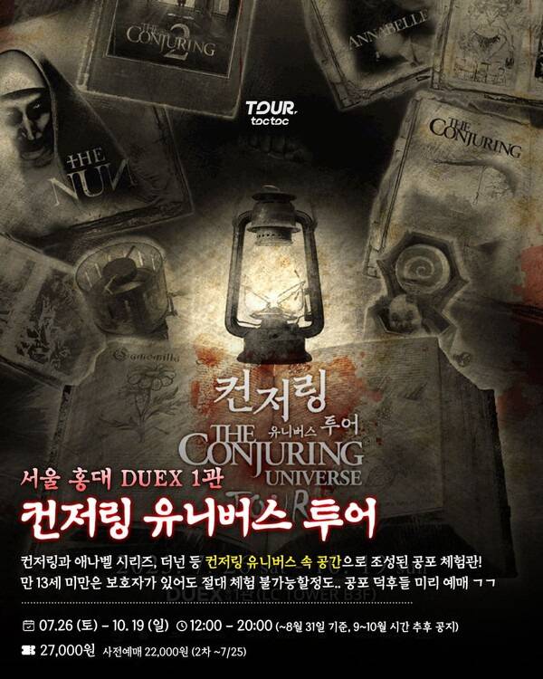 컨저링과 애나벨 시리즈, 더넌 등 컨저링 유니버스 속 공간으로 조성된 공포체험이 서울에 상륙합니다. 서울 홍대에서 약 3달 여 간 운영되는 컨저링 유니버스 투어는 실내 공포 체험 전시로, 영화 속 장소를 그대로 재현해내 체험 내내 영화의 내용이 연상되어 무서움을 배로 느낄 수 있습니다.