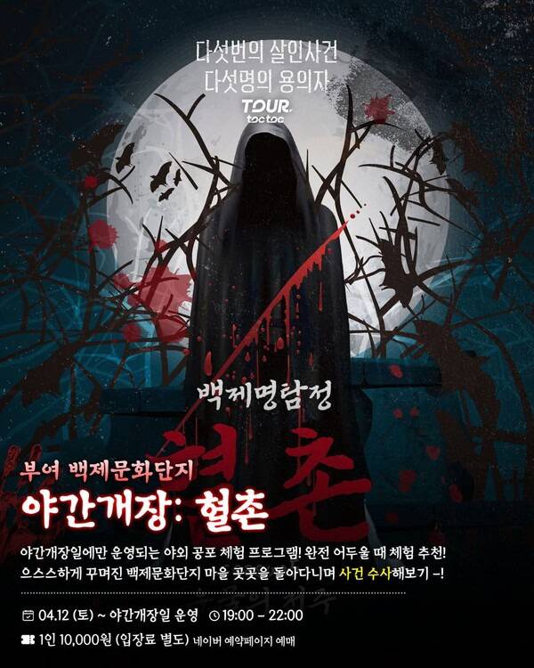 충남 부여의 백제문화단지 야간개장일에는 공포체험 '혈촌'이 운영됩니다. 옛 민가를 연상케하는 마을 일부가 밤이 되면 공포스러운 분위기로 탈바꿈되는데요. 참가자들은 으스스한 마을을 구석구석 둘러보며 살인사건에 대한 단서를 찾고, 사건을 해결해야 하는 추리형 공포체험입니다.