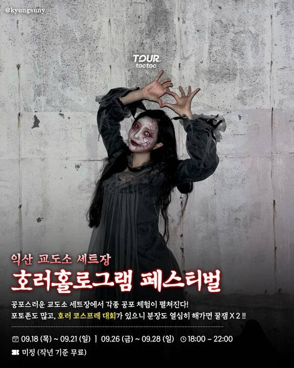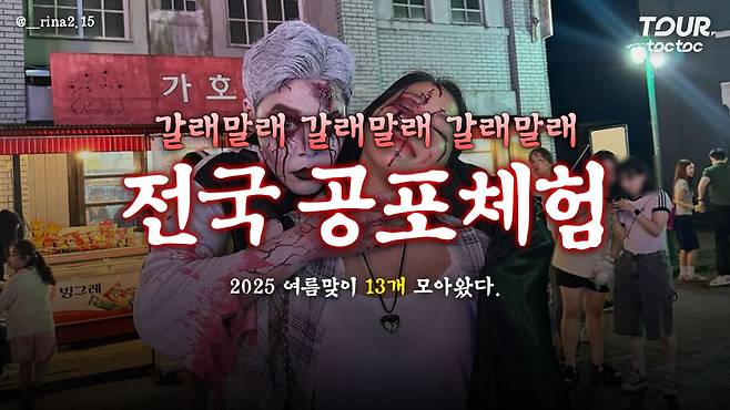 오늘 여행톡톡은 2025 전국 공포체험 12개를 총정리해 소개합니다. 만 13세 미만은 체험이 불가능할만큼 강도 높은 공포체험부터, 어린아이들도 함께 참여할 수 있는 축제 분위기의 공포체험까지 전국 공포체험을 모두 소개해드릴 예정인데요.