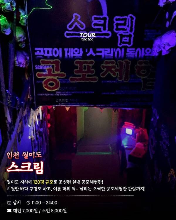 더운 여름, 바닷바람과 함께 산책을 즐기기 위해 월미도를 찾았다면 이색 공포체험으로 보다 특별한 추억을 만들어보는 것은 어떨까요? 정통 귀신의 집으로 평가받는 인천 월미도 스크림은 지하에 조성된 120평의 공포 체험장입니다.