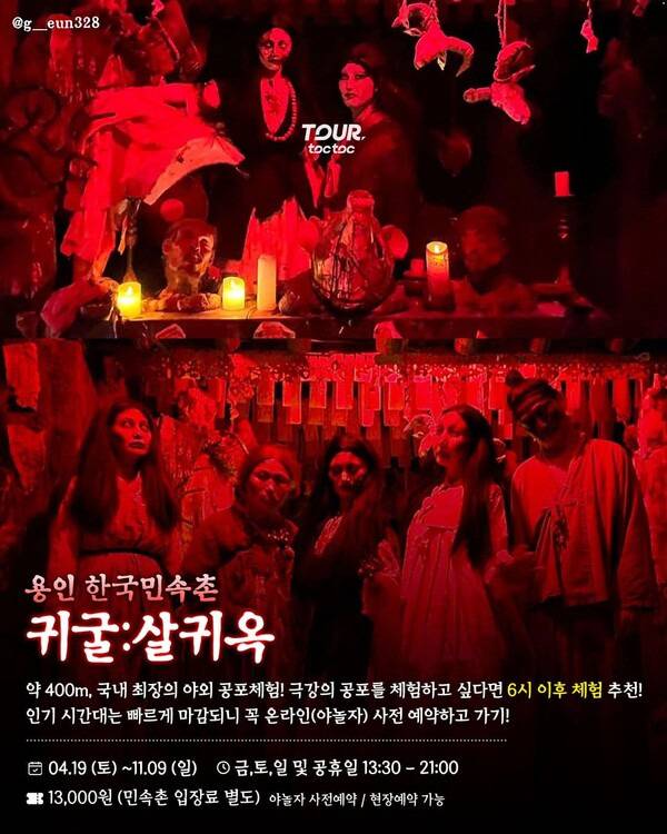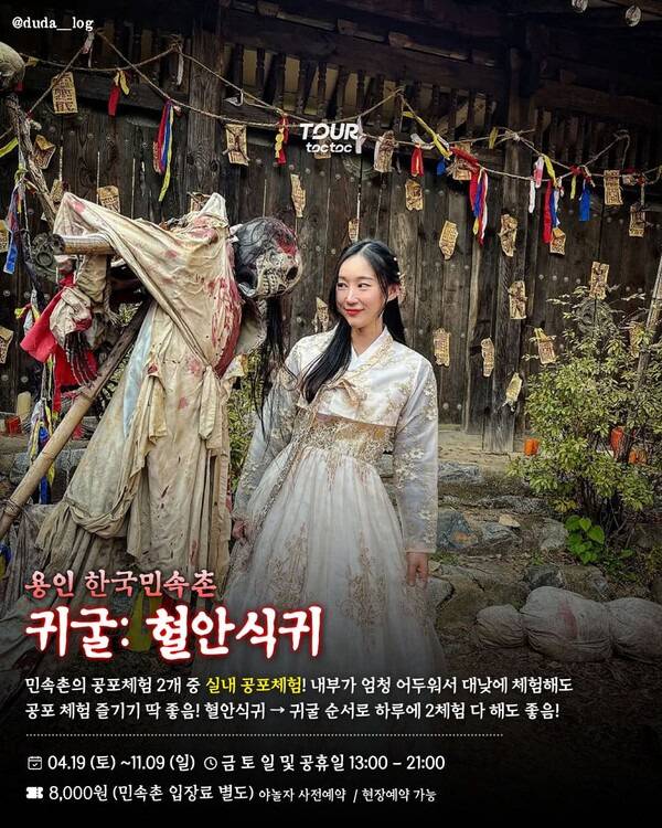 용인 한국민속촌 공포체험 귀굴은 매년 4월부터 11월까지 야간개장 기간에 운영됩니다. 봄부터 가을까지 매주 금, 토, 일 및 공휴일에 운영되고 있는데요. 귀굴 살귀옥은 약 400m의 코스로 구성된 야외 공포 체험으로, 으스스하게 꾸며진 숲 속 한옥들이 몰입감을 더해줍니다.