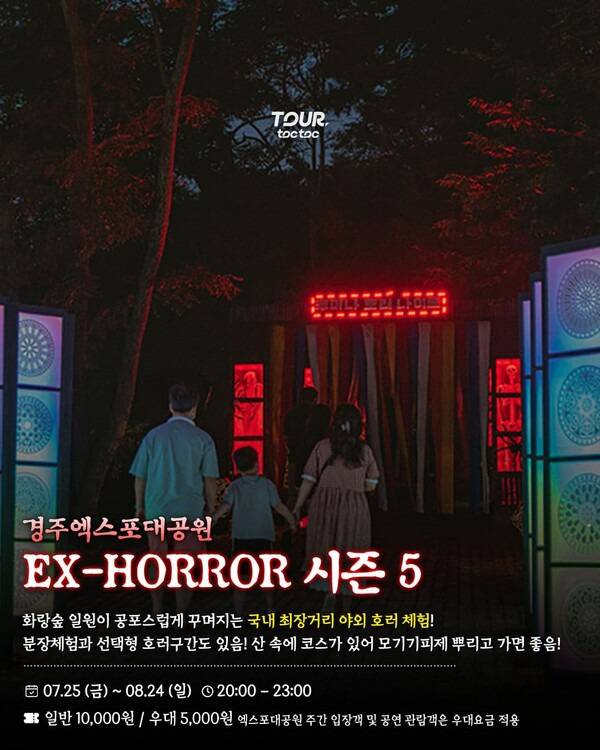 경주 엑스포대공원에서는 매년 여름 약 한 달동안 공포체험인 엑스호러(EX-HORROR)가 운영됩니다. 화랑숲 일원 전체가 공포체험장으로 탈바꿈해 국내 최장거리 야외 체험이라는 타이틀을 쥐고 있기도 한데요.