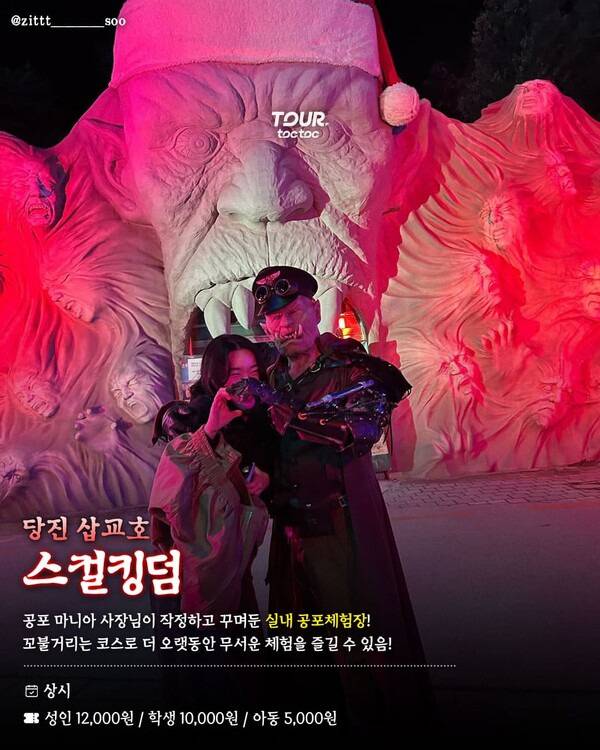 공포 마니아인 사장님이 직접 꾸미고 운영하는 실내 공포체험장입니다. 당진 삽교호 놀이동산 내에 위치하고 있으며 개별 입장료로 운영되고 있습니다. 외관부터 웅장하지만, 실내로 들어가면 꼬불꼬불한 코스로 구성되어 있어 체험 시간이 더 길게 느껴지곤 하죠.