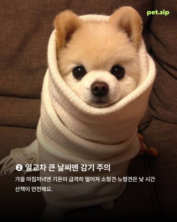 가을철엔 아침저녁으로 기온이 급격히 떨어집니다. 특히 소형견이나 노령견은 체온 유지가 어려워 감기에 걸리기 쉽습니다. 가능한 한 낮 시간대에 산책하는 것이 좋습니다.