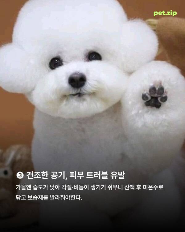 가을엔 습도가 낮아 강아지의 피부가 쉽게 건조해집니다. 산책 후 미온수로 발을 닦고, 강아지 전용 보습제를 발라주세요. 각질이나 비듬이 생겼다면 목욕 횟수를 줄이는 것도 좋습니다.