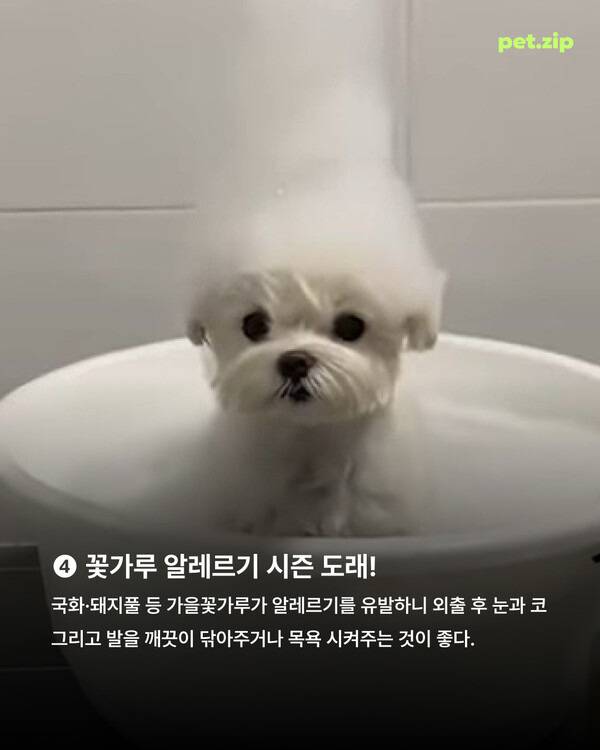 국화, 돼지풀 등 가을철 꽃가루는 반려견의 알레르기를 유발할 수 있습니다. 외출 후엔 눈과 코, 발을 깨끗이 닦아주고 가벼운 샤워로 꽃가루를 제거하세요.