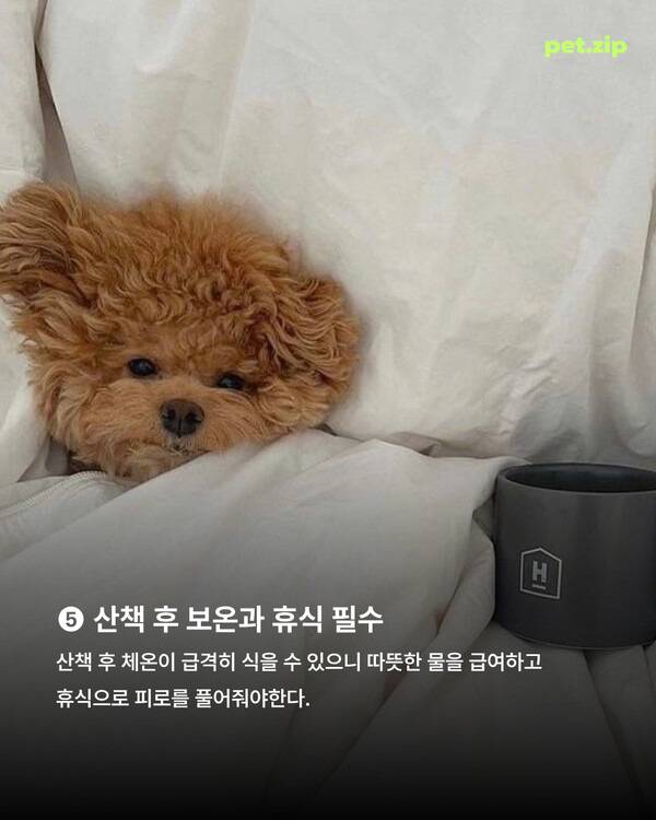 산책 후에는 체온이 급격히 떨어질 수 있으므로 따뜻한 물을 급여하고, 실내에서 충분히 휴식하게 해주세요. 따뜻한 침구나 담요를 준비해주는 것도 좋은 방법입니다.