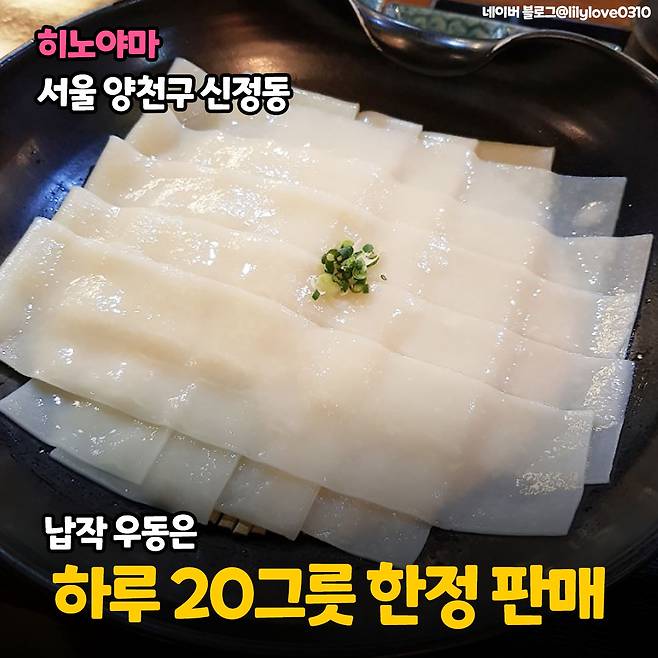 점심 10그릇, 저녁 10그릇 하루에 총 20그릇만 판매하는 납작 우동 한 상을 먹을 수 있는 곳입니다. 30년 전통을 자랑하는 이 식당은 11시간 직접 고온 숙성 반죽으로 빚어낸 면을 바로 뽑아 삶아준다고 해요.