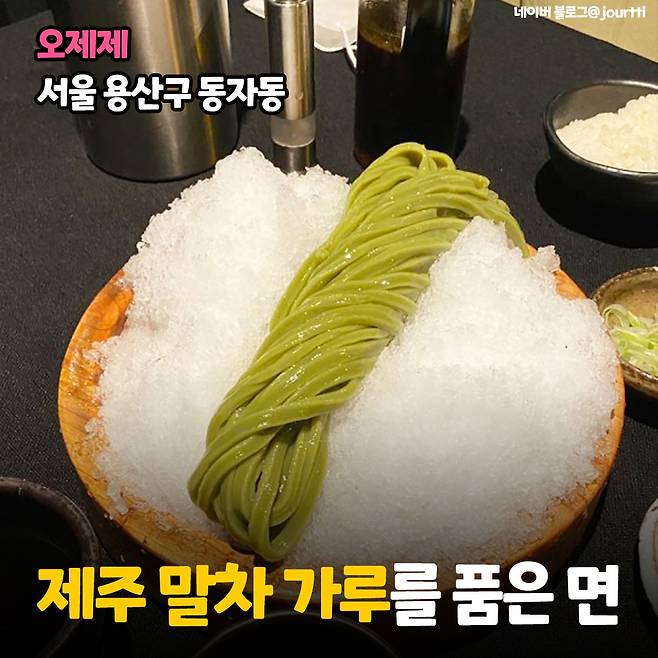 제주 말차 가루로 면을 만들어서 예쁜 색감을 자랑해 저절로 사진을 찍게 만드는 비주얼이라고 하네요. 찍어 먹는 쯔유는 달달한 편이고 탱글한 우동면이 입 안을 꽉 채워 기분 좋은 식감이라고 합니다.