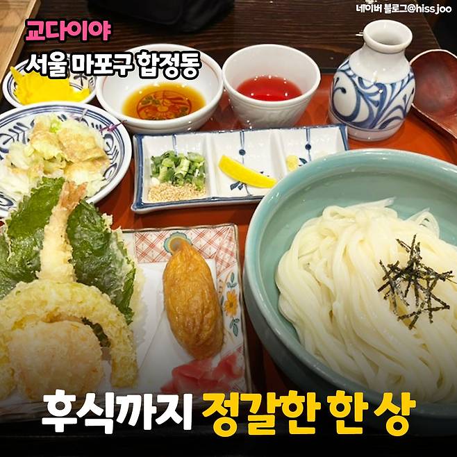 납작 우동과 함께 단무지, 유부초밥 2개, 새우, 단호박, 양파, 깻잎 튀김, 차완무시와 디저트까지 한 번에 제공되어 정갈한 한 끼를 먹을 수 있다고 하네요. 설명만 봐도 웨이팅이 끊이지 않는 이유를 알 것 같은데요?!