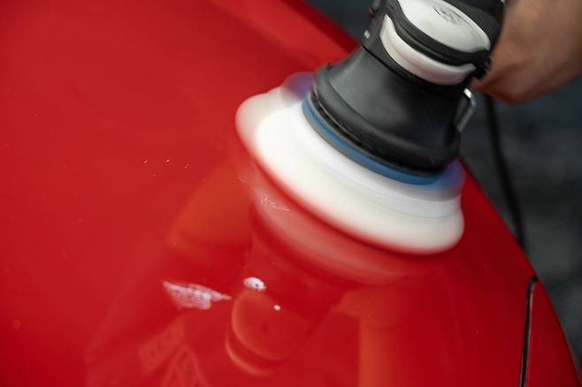 작업 방법은 1차 때와 동일하다. 먼저 광택기의 회전속도를 1단에 맞춰 컴파운드를 골고루 펴 바른 다음, 속도를 높여 ‘구석구석’ 꼼꼼히 광택기를 돌려준다. ‘ㄹ’자 형태로 보닛 위에서부터 천천히 아래로 내려가며 광택 작업을 하는 게 좋다. 작업이 끝난 후엔 부드러운 극세사 타월로 가볍게 닦아주면 된다.