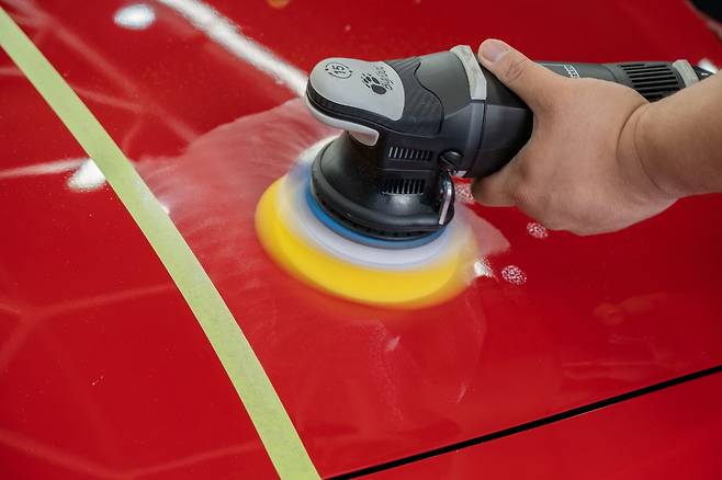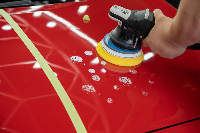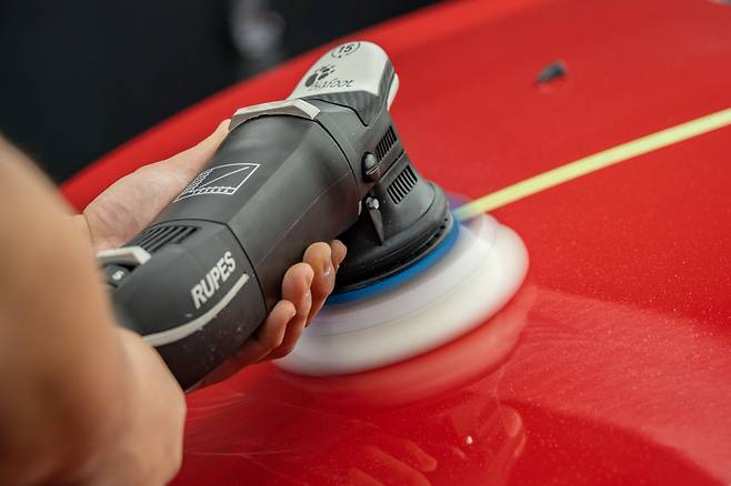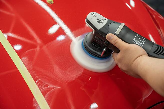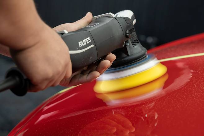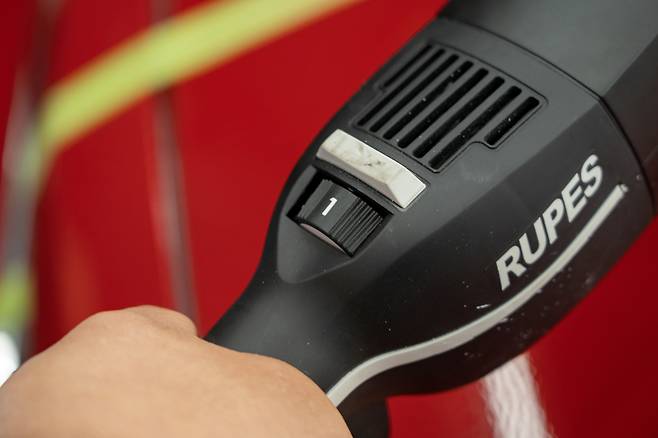 어느 정도 제품을 도포했다면, 본격적으로 연마 작업을 시작할 차례. 광택기의 회전속도를 5~6단으로 올린 다음, 서서히 광택 작업을 진행한다. 이때, 광택기를 무리한 힘으로 누르지 않고 최대한 도장면과 수직을 유지한 상태로 진행해야 한다.
