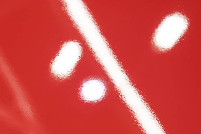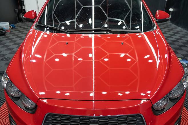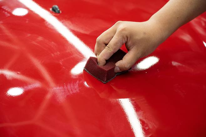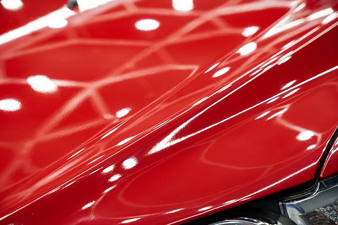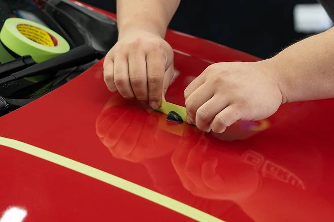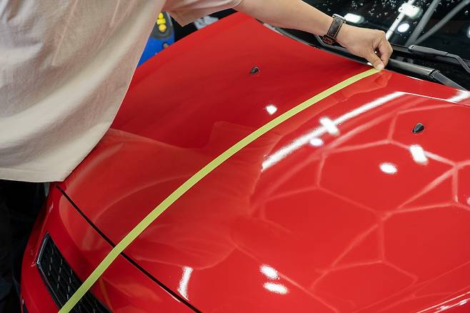 광택 작업의 효과를 전달하기 위해, 보닛 중앙에 마스킹 테이프를 붙였다. 왼쪽은 광택 작업을 안 한 ‘생’ 도장면, 오른쪽은 광택 작업을 할 도장면으로 구성했다.