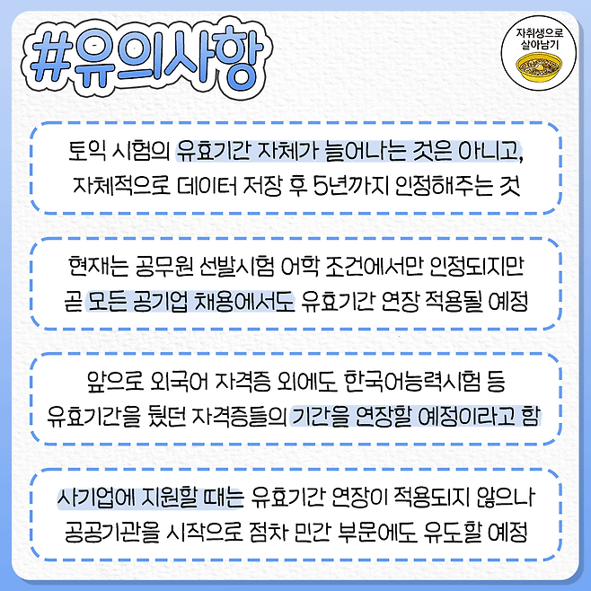 *토익 유효기간 연장은 2023년부터 시행되는 공공기관 채용에서만 적용되며, 민간 기업 지원 시 각 채용 공고문에 고지된 자격증 유효기간 조건을 반드시 확인해주세요.