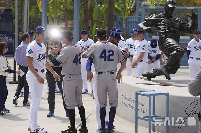 [로스앤젤레스=AP/뉴시스] '재키 로빈슨의 날'인 15일(현지 시간) LA 다저스의 오타니 쇼헤이(왼쪽)가 미 캘리포니아주 로스앤젤레스 다저스타디움에서 콜로라도 로키스와의 경기 전 콜로라도 선수들과 얘기를 나누고 있다. 메이저리그(MLB)는 인종 차별 장벽을 허물고 흑인 선수로는 처음 MLB 무대에 선 로빈슨을 기념해 4월 15일에 모든 선수가 42번 유니폼을 입는다. 로빈슨은 1947년 4월15일 브루클린 다저스 1루수로 처음 출전했다. 2025.04.16.