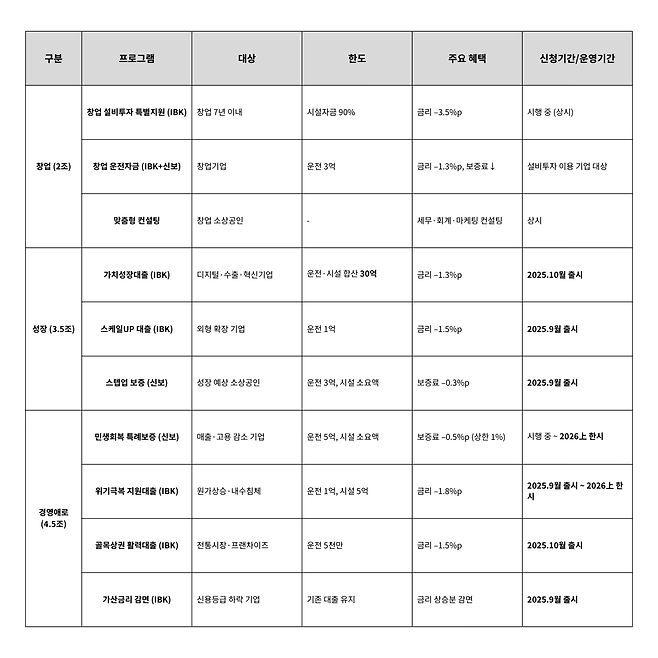 - 규모: 총 10조 원 (창업 2조 / 성장 3.5조 / 경영애로 4.5조)