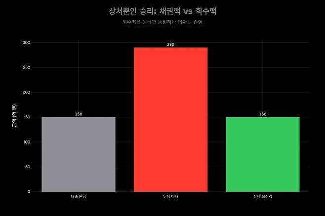 그러나 일본 거품 경제 붕괴로 인해 담보물의 가치는 처참하게 하락해 있었다. 결국 외환은행이 경매 등을 통해 실제로 회수할 수 있었던 금액은 원금 수준인 약 150억 엔에 불과했다. 30년이라는 긴 세월 동안 발생한 290억 엔(당시 환율 기준 약 2천억 원)의 이자 수익은 허공으로 사라진 셈이다.