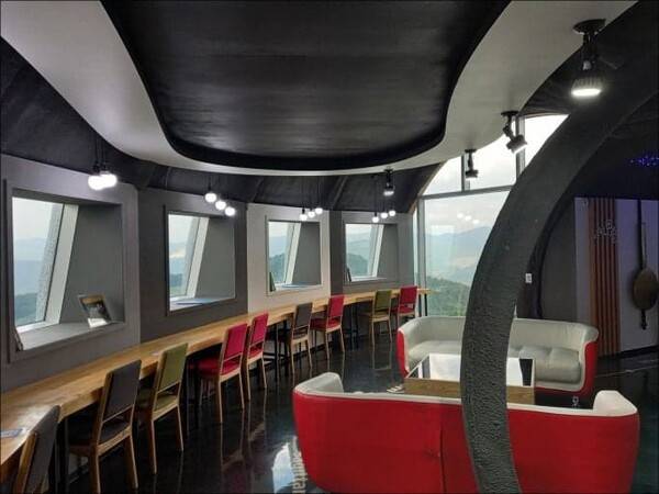 내부는 긴 터널 형태의 통유리로 꾸며져 있어, 커피 한 잔을 마시며 타임캡슐공원과 주변 산세, 푸른 하늘을 한눈에 감상할 수 있습니다. 카페의 음료는 정선군시설관리공단에서 운영하는 만큼 합리적인 가격에 제공되고, SNS에서 사진 맛집으로도 유명합니다.