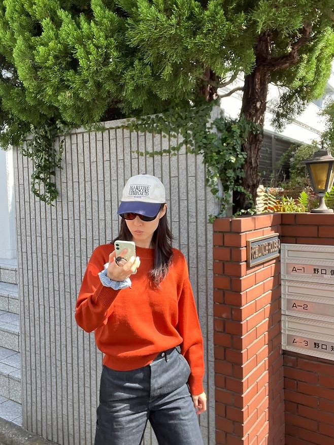 가을 햇빛 아래에서 따뜻하게 살아나는 컬러라 얼굴빛까지 고급스럽게 보여줬고, 니트의 루즈한 실루엣이 캐주얼함을 더해줬어요.