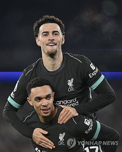 epa11797884 Trent Alexander-Arnold (L) of Liverpool celebrates with Curtis Jones after scoring his side's fourth goal in the English Premier League match between West Ham United and Liverpool in London, Britain, 29 December 2024. EPA/VINCE MIGNOTT EDITORIAL USE ONLY. No use with unauthorized audio, video, data, fixture lists, club/league logos, 'live' services or NFTs. Online in-match use limited to 120 images, no video emulation. No use in betting, games or single club/league/player publications.