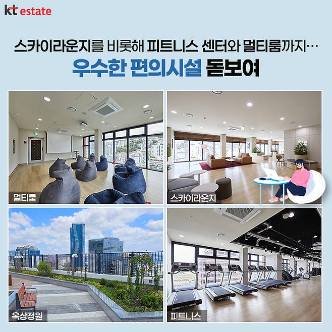 운동 공간으로는 피트니스 센터와 GX룸이 있는데요. GX룸에서는 전면의 통창으로 부산 앞바다와 도심 풍경을 배경 삼아 다양한 운동을 즐길 수 있습니다. 그 옆 피트니스 센터에서는 100여 평 공간에 약 30가지의 운동 기구를 통해 체력을 단련할 수 있습니다. 또, 20층으로 올라가면 부산 시내를 한눈에 조망할 수 있는 옥상정원도 마련돼 있습니다.
