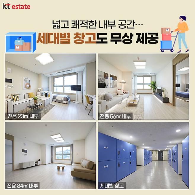 세대로 올라가는 엘리베이터는 입주민 전용 카드키로 작동해 안심이 되는데요. 먼저 전용 면적 23㎡의 경우, 가장 작은 평형임에도 전면 통창과 화이트 톤의 인테리어로 넓고 쾌적한 느낌을 줍니다. 내부에는 빌트인 수납장, 노트북 책상, 시스템 에어컨, 냉장고, 인덕션, 세탁기(건조 기능 포함), 전자레인지 등 풀 빌트인 시스템을 제공해 1인가구가 살기 편리합니다. 또한, 세대마다 복도에 세대별 창고를 무상 제공해 보다 넉넉한 수납공간을 자랑합니다.