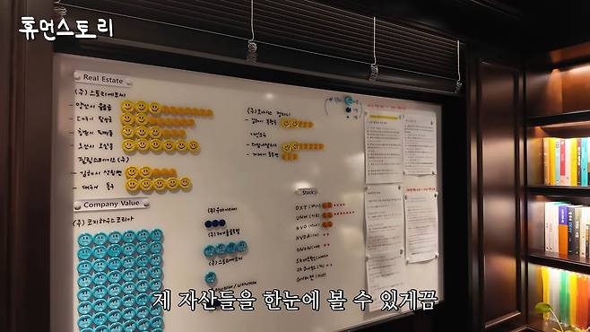 여기는 저의 서재로, 책을 읽는 공간입니다. 여기에는 저희 법인에서 매입한 부동산 자산을 한눈에 볼 수 있게 표기해 놓았습니다. 큰 스마일은 10억 원, 작은 스마일은 1억 원을 뜻하며, 양산 물금 쪽에는 37억 원짜리 자산도 있습니다. 옆에는 회사 가치를 매년 업데이트한 것을 보는데, 현재 약 600억 원 정도의 가치를 가지고 있다고 봅니다. 저희가 운영하는 법인 회사는 5개 정도 있어요.