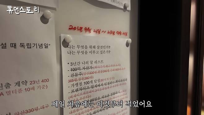 저는 3년마다 계획을 잡고 이룰 때마다 줄을 그어 놓는데, '자산 1,000억 달성하기' 같은 목표도 있습니다. 이 목표들을 처음 적었던 날은 2020년 9월 21일이었습니다. 코지하우스를 막 오픈했을 때라 돈도 없고, 처음으로 죽고 싶다는 생각을 했던 날이거든요. 새벽에 갑자기 발작을 하며 일어났고, 공황장애와 협심증 진단을 받았습니다. 너무 심해지다가 갑자기 죽고 싶다는 생각이 들더라고요. 그래서 그날 정신 차리고 '왜 살아야 되는지부터 적자' 해서 '나는 무엇을 위해 살 것인가'를 적었습니다. 저 날이 가장 중요했던 터닝 포인트였던 것 같아요. 경제적으로 힘들 때는 오히려 괜찮았는데, 나중에 정신과에 가니 만성 우울증과 불안장애가 쌓여있었다고 하더라고요. 의사 선생님은 힘들 때 몸이 힘든 줄 모르고 살았던 것이라고 말씀하셨죠.