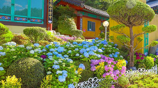 전라남도 광양에는 이 계절에만 피는 수국을 온전히 즐길 수 있는 특별한 장소가 있다. 번잡함과는 거리가 먼 고요한 절집, 길상사다.