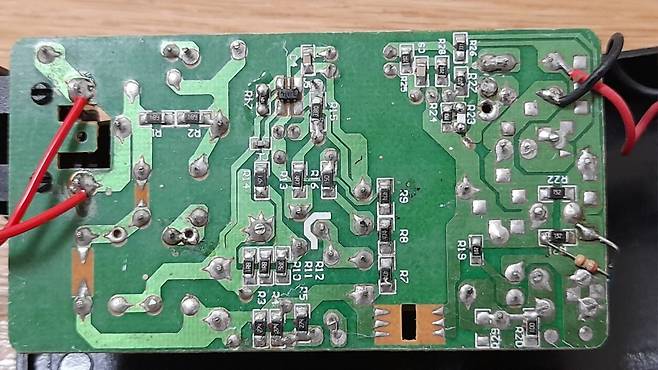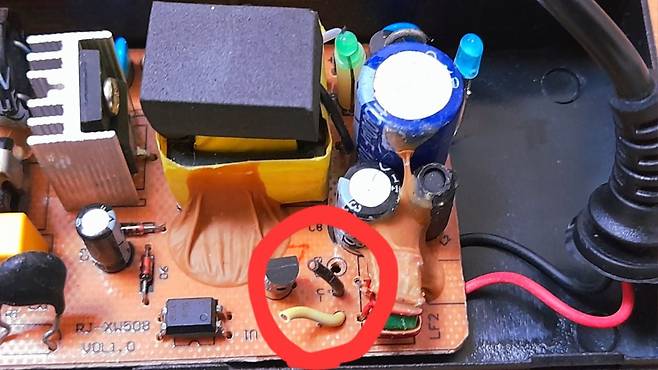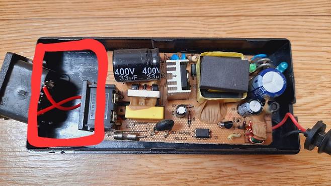 저용량 8자코드 암컷이 붙어있는 기판에 일반 컴퓨터용 파워코드 암컷을 얇은 붉은색 전선에 납땜하여 2중 포장을 해놓음.