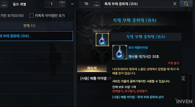 이번 특제 부패 중화제는 2관문 보스와 관련이 있다. 아이템 설명을 보면 '나이트레아의 맹독에 노출된 상태에서 즉사 피해를 받지 않습니다'라고 쓰여 있다. 지난 2막의 나로크가 체온 관리를 쉽게 해주는 아이템이었다면, 이번에는 맹독 스택 관리와 관련된 아이템으로 예상된다.