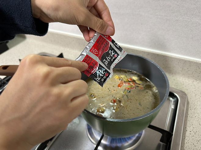 물 550ML를 받아주신 후 물이 끓기 시작하면 분말 수프와 후레이크와 면을 다 같이 넣어 끓여주도록 할게요.