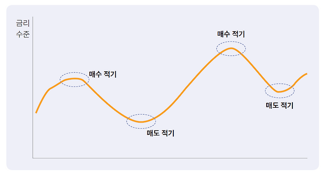 아래 이미지처럼 금리 수준이 높을 때는 만기가 긴 채권을 보다 많이 매수하고 금리 수준이 낮을 때는 만기가 짧은 채권을 매수하는 투자 운용을 지속한다면 매우 좋은 수익률을 얻을 수 있답니다.