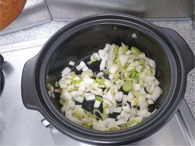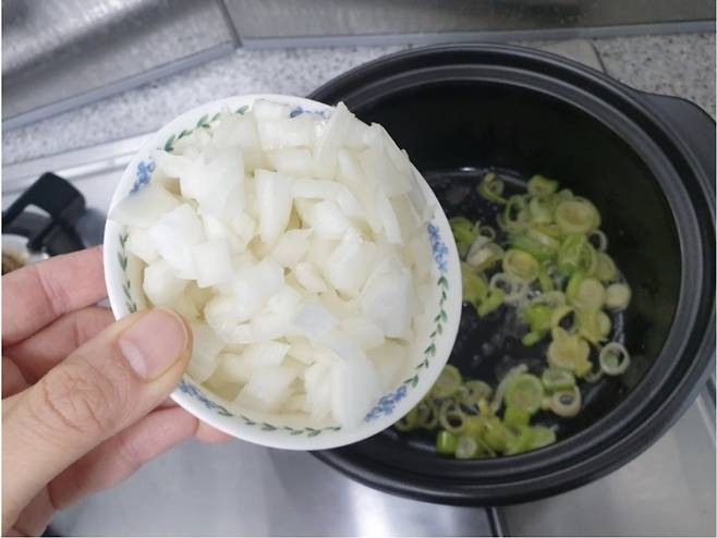 어느 정도 됐다 싶으면 다져둔 양파를 넣어서 볶아주세요