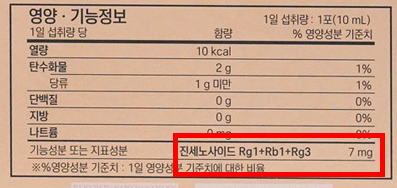 '진세노사이드' 함량은 위의 사진처럼 제품 앞면이나 뒷면 영양성분표를 통해 확인할 수 있습니다.