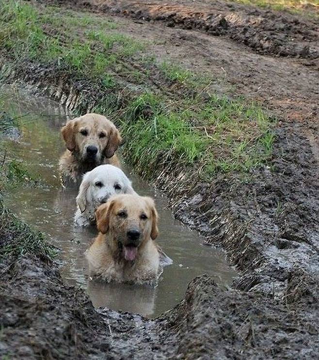 주인이 애타게 이름을 부르며 찾아냈을 때, 녀석들은 이미 일렬종대로 나란히 서서 깊은 진흙 속에 몸을 담그고 있었습니다.