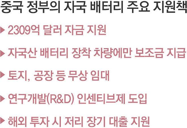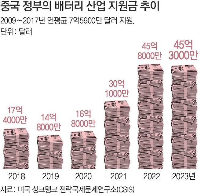 지원 규모는 산업 생태계가 안착한 이후에도 꾸준히 증가했다. CSIS 데이터에 따르면 2009년부터 2017년까지 연평균 10억 달러 미만이던 지원 규모는 2018∼2020년 연평균 16억4000만 달러로 증가했고, 2021∼2023년에는 연평균 40억 달러 이상으로 확대됐다. 점유율 1위 업체인 CATL의 경우에도 2018년부터 2023년까지 받은 정부 지원금만 18억 달러에 이른다. 이 외에도 중국의 경우 원재료라고 할 수 있는 주요 광물 수급의 자국 의존도가 높은 반면에 한국의 경우 전구체나 리튬 등 핵심 광물의 해외 의존도가 70∼90%에 달하는 상황이다. 막대한 내수 시장까지 갖고 있는 중국 기업들의 가격 경쟁력과 생산 규모를 따라잡기 어려운 상황이다.