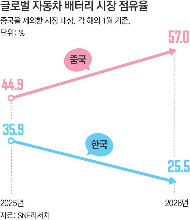 국내 배터리 업계의 점유율 하락은 양극재 기술에 대한 전략 차이와 중국의 대규모 산업 지원 정책이 맞물린 결과로 풀이된다. 상용화 초기에 한국은 에너지 밀도가 높아 1회 충전 주행거리가 긴 니켈·코발트·망간(NCM) 기반의 ‘삼원계 배터리’에 역량을 집중했다. 반면 중국은 무겁고 주행거리가 짧지만 원가가 저렴한 리튬인산철(LFP) 기술 고도화에 주력했다.