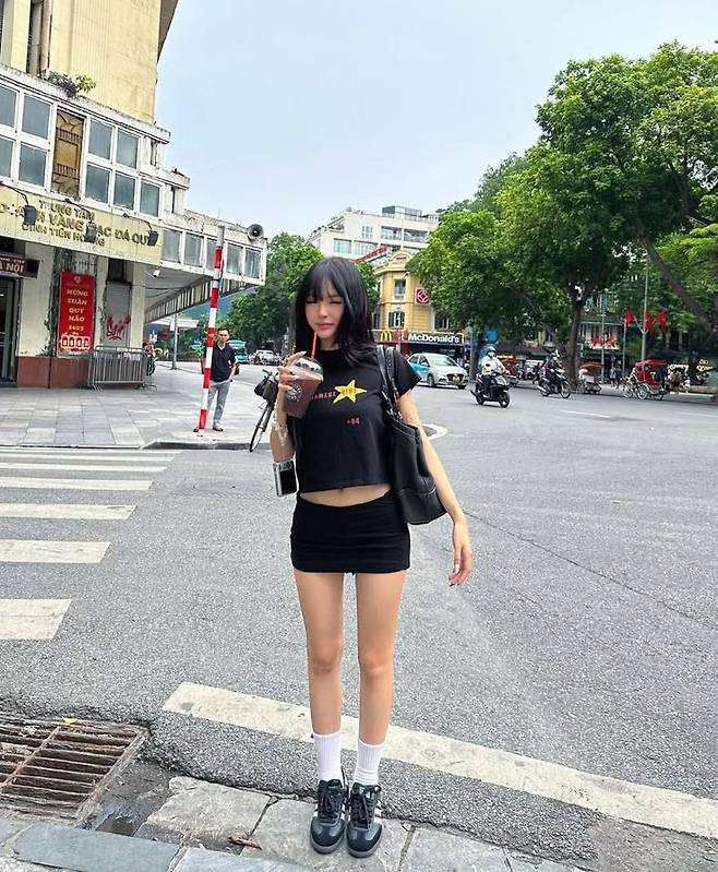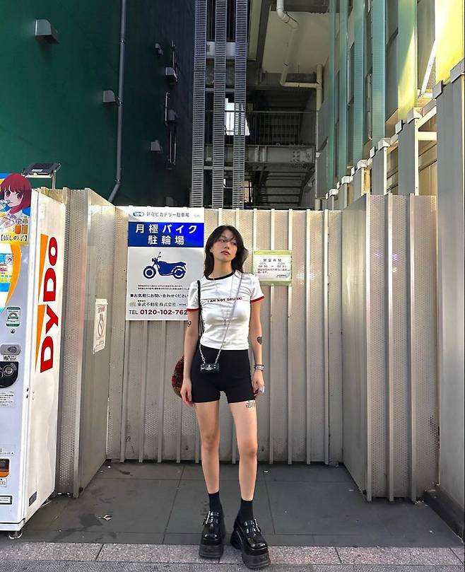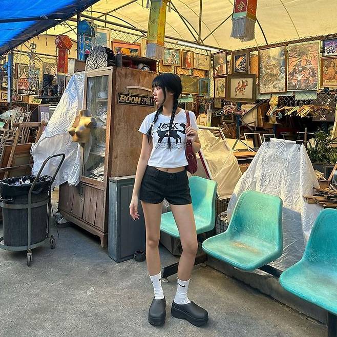 크롭 티셔츠에 하이웨이스트 쇼츠를 매치하면 다리가 길어 보이는 효과가 있습니다.